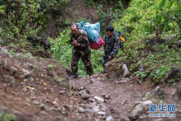 ▲在云南省迪庆藏族自治州香格里拉滇金丝猴国家公园,护猴员余小德(左)背着喂滇金丝猴的食物上山(2020年5月23日摄)。新华社记者 胡超 摄