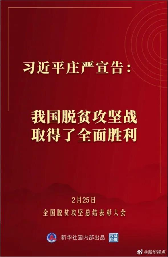 全国脱贫攻坚总结表彰大会于2月25日上午在北京人民大会堂隆重举行。中共中央总书记、国家主席、中央军委主席习近平向全国脱贫攻坚楷模荣誉称号获得者颁奖并发表重要讲话。大会还对全国脱贫攻坚先进个人、先进集体进行表彰。