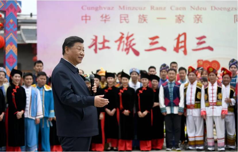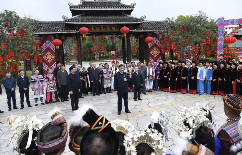 4月27日上午,正在广西南宁考察的习近平总书记来到广西民族博物馆,了解壮族历史、文化习俗等情况。博物馆外,正在举办三月三“歌圩节”民族文化活动,习近平不时驻足观看,向大家挥手致意,为大家鼓掌。习近平高兴地说,广西这些年发展进步很大,脱贫攻坚任务顺利完成了,630多万人脱贫。我说过,脱贫路上一个也不能少,一个民族都不能少。中国人说话、中国共产党说话、中国共产党的领导说话是算数的。现在全中国56个民族都脱贫了,兑现了我们的庄严承诺。我们还不能停步,接下来要向着第二个百年奋斗目标新征程迈进,一个民族也不能少,加油、努力,再长征!