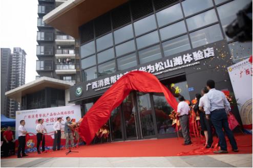 5月8日上午,广西消费帮扶产品松山湖体验店在东莞市华为松山湖基地正式揭牌开业。自治区国资委一级巡视员高旭出席活动并宣布开馆;自治区扶贫办党组成员、广东省第二扶贫协作工作组常务副组长李冠强为活动致辞。深圳市扶贫协作和合作交流办公室党组成员、机关党委书记林更斌,广西农村投集团党委副书记、工会主席、董事朱玉红,广东南粤集团副总经理张建强等粤桂两省区有关部门、企业领导共同揭幕。