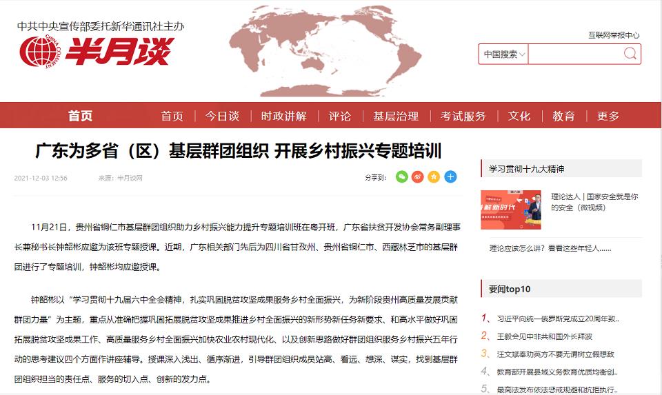 11月21日,贵州省铜仁市基层群团组织助力乡村振兴能力提升专题培训班在粤开班,广东省扶贫开发协会常务副理事长兼秘书长钟韶彬应邀为该班专题授课。近期,广东相关部门先后为四川省甘孜州、贵州省铜仁市、西藏林芝市的基层群团进行了专题培训,钟韶彬均应邀授课。