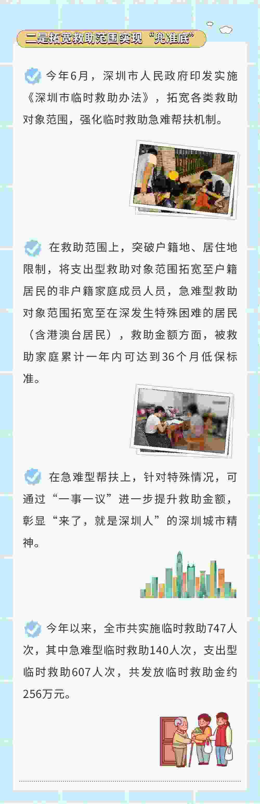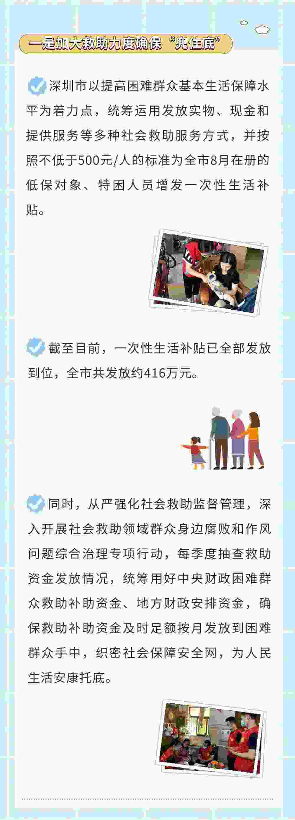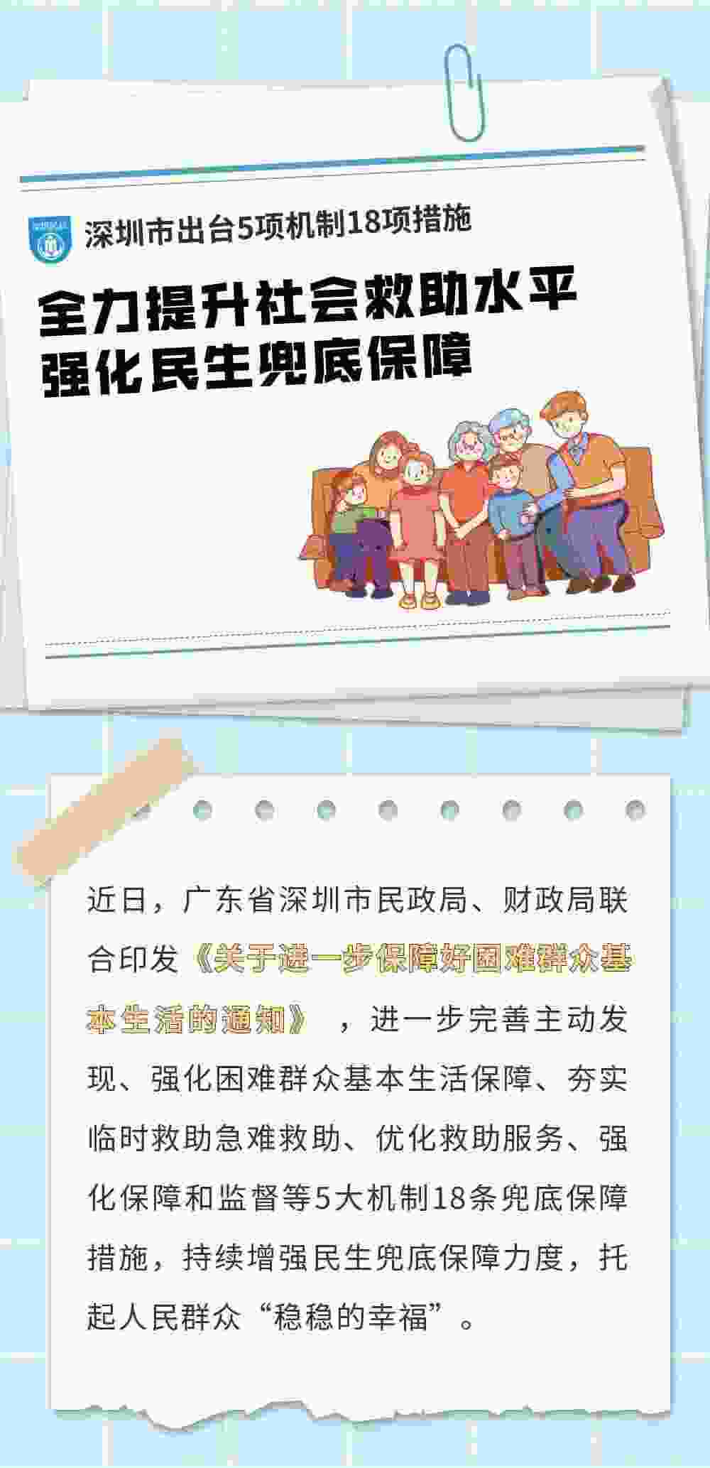 民生无小事,枝叶总关情。近日,深圳出台5项机制18项措施,全力提升社会救助水平,强化民生兜底保障,把关爱和温暖送到困难群众心坎上,为困难群众兜住底、兜准底、兜好底,托起人民群众“稳稳的幸福”。