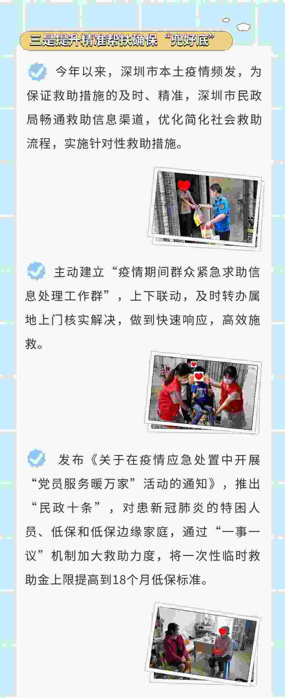 深圳民政系统将以增进人民福祉为出发点和落脚点,针对不同特殊困难群众分类、精准、综合施策,确保为困难群众兜住底、兜准底、兜好底,持续提升困难群众的服务保障水平,让人民群众的获得感成色更足、幸福感更可持续、安全感更有保障。
