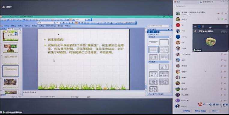仲恺农业工程学院陈青春副教授和杨静美高级实验师分别就农户关注的“花生优质高产栽培”“花生病虫害防治”作线上专题报告,两位专家紧扣实际问题,结合个人实践经验,图文并茂,细致生动地讲解了相关概念、问题和解决办法,以及相关的最新技术。