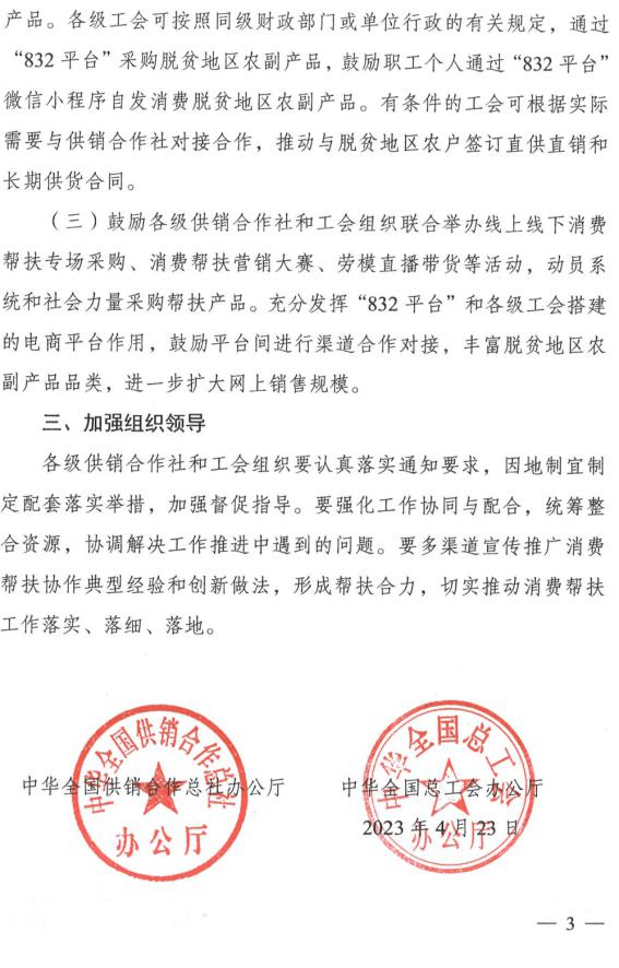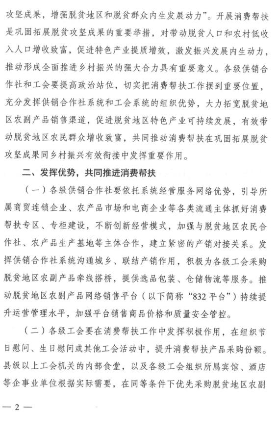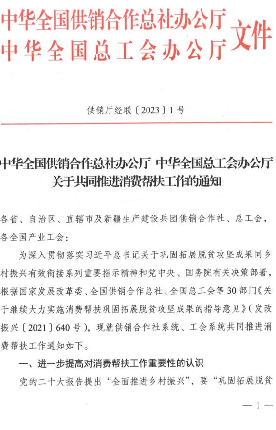 为深入贯彻落实习近平总书记关于巩固拓展脱贫攻坚成果同乡村振兴有效衔接系列重要指示精神和党中央、国务院有关决策部署,根据国家发展改革委、全国供销合作总社、全国总工会等30部门《关于继续大力实施消费帮扶巩固拓展脱贫攻坚成果的指导意见》有关部署,4月23日,中华全国供销合作总社办公厅、中华全国总工会办公厅发布《关于共同推进消费帮扶工作的通知》,就供销合作社系统、工会系统共同推进消费帮扶工作作出进一步要求。