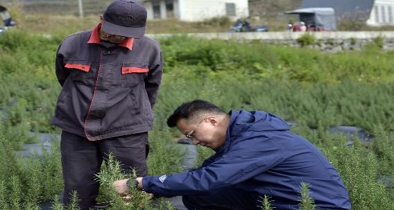 戴维(右一)在凤山乡马干山越秀农牧消纳区种植基地查看迷迭香生长情况