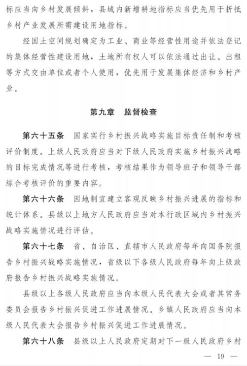 县级以上政府应推进城乡统筹规划,整体考虑城乡发展,统筹谋划产业发展、基础设施、社会保障、公共服务、资源能源、生态环境保护等布局;优化乡村发展布局,因地制宜编制村庄规划,结合村庄实际,分类推进村庄建设等。在扶持措施方面,《草案》强调,县级以上地方人民政府应当健全农村土地管理制度,节约集约用地,提高土地使用效率;依法采取措施盘活农村存量建设用地,激活农村土地资源资产,完善农村新增建设用地保障机制,满足乡村振兴的用地需求;建设用地指标应当向乡村发展倾斜,县域内新增耕地指标应当优先用于折抵乡村产业发展所需建设用地指标;经国土空间规划确定为工业、商业等经营性用途并依法登记的集体经营性建设用地,土地所有权人可以依法通过出让、出租等方式交由单位或者个人使用,优先用于发展集体经济和乡村产业,不得擅自用于销售型商品住房开发;鼓励依托公共资源交易平台进行建设用地使用权出让和农村集体土地经营权流转等。