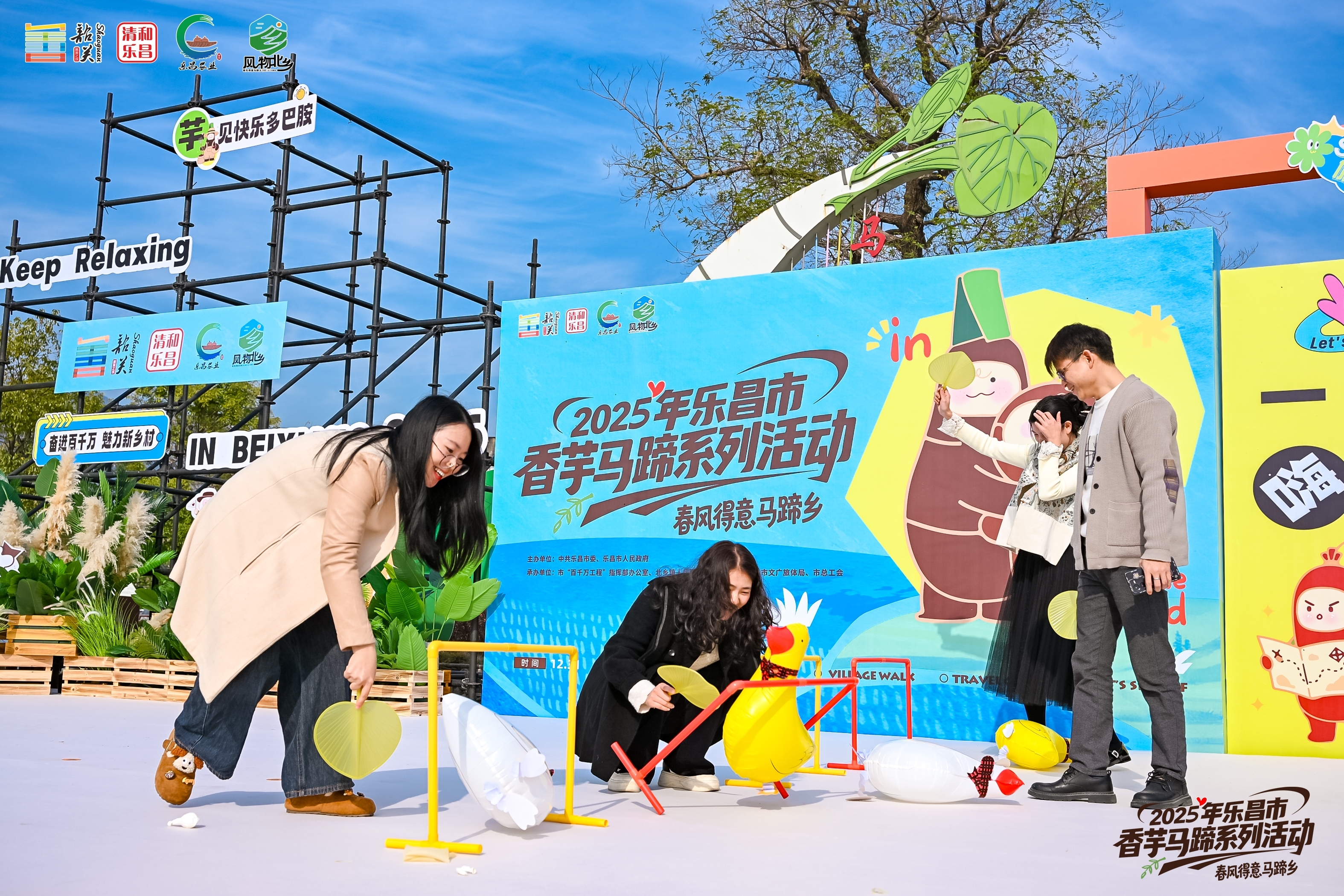 此次活动共有八大板块,涵盖场景体验、主题市集、游园打卡与户外运动等。现场设置了以北乡特产IP为主题的疗愈集合站、外貌焦虑修复院、压力转化训练营、松弛感充电站及乡土智慧传承馆五大沉浸式场景;同时开设汇聚了乐昌非遗手工艺品、特色农产品及其延伸菜品的主题市集,并围绕“情绪流转”主线,布置了包括能量集结拍照、特色DIY体验、情绪抒发与特产品鉴在内的七大打卡点,增强游园互动性。活动还设置了有奖问答环节,开展了趣味十足的夹马蹄大赛、赶走鸭力大赛。其中,沉浸式乡村乐园、主题市集、游园打卡体验等活动将持续到元旦当天,诚邀市民朋友们喜迎新年。