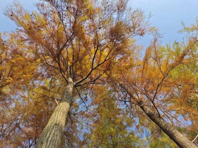 导航至“大岭山森林公园观湖广场”,沿木质栈道深入林中,便能邂逅冬日限定的色彩盛宴。落雨杉的叶子褪去翠绿,化作深绿、金黄与红棕的渐变色调,高低错落的枝干倒映在水中,阳光穿过枝叶洒下斑驳光影,行走其间宛如闯入童话世界。暖冬的午后,静立栈道旁,看水面波光粼粼,听林间鸟鸣啾啾,惬意十足。