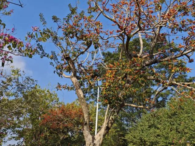同沙生态公园的葱郁林间,不时冒出一树树紫花。粉紫色花球压满枝头,“见花不见叶”的盛况如烟似霞;微风拂过,花朵轻摇如铃铛低语。阳光洒落时,花瓣色泽愈发艳丽,沿绿道骑行赏花,或在广场与花海合影,都能感受岭南冬日独有的浪漫。花期从12月延续至次年3月,元旦打卡正当时。