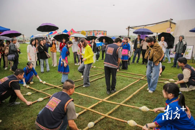 游客体验竹竿舞。图源韶关市融媒体中心