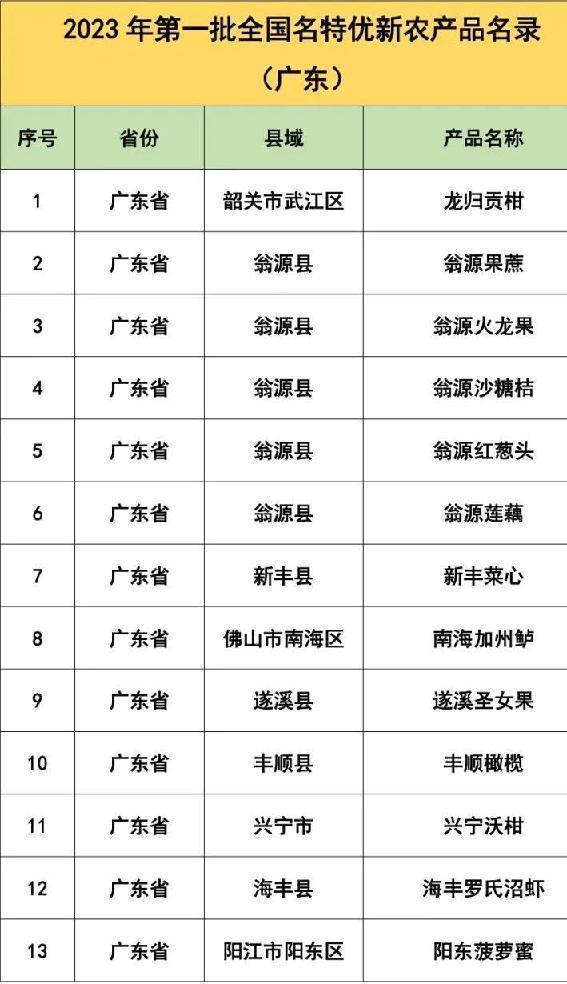 近日,农业农村部农产品质量安全中心公布2023年第一批全国名特优新农产品名单,其中,广东省13个农产品入选。