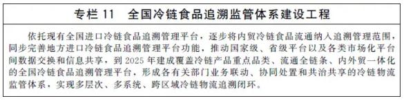 加快建设全国性冷链物流追溯监管平台,完善全链条监管机制,针对冷链物流环境、主要作业环节、设施设备管理等重点,规范实时监测、及时处置、评估反馈等监管过程,逐步分类实现全程可视可控、可溯源、可追查。创新监管手段,加大现代信息技术和设施设备应用力度,强化现场和非现场监管方式有机结合。借鉴新冠肺炎疫情防控期间进口冷链食品检验检测检疫经验做法,优化完善工作机制,建立科学、可靠、高效的冷链物流检验检测检疫体系。