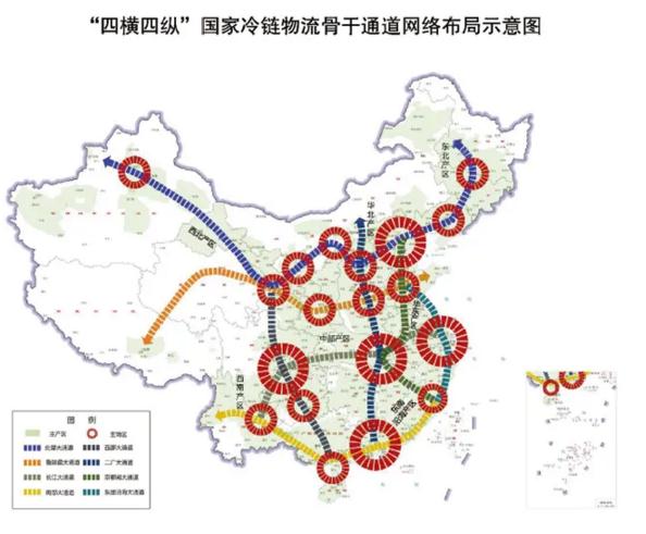 结合我国冷链产品流通和进出口主方向,串接京津冀、长三角、珠三角、成渝、长江中游等城市群与西北、西南、东南沿海、中部、华东、华北、东北等农产品主产区,建设北部、鲁陕藏、长江、南部等“四横”冷链物流大通道,以及西部、二广、京鄂闽、东部沿海等“四纵”冷链物流大通道,形成内外联通的“四横四纵”国家冷链物流骨干通道网络(见附件),发挥通道沿线国家骨干冷链物流基地、产销冷链集配中心基础支撑作用,提升相关口岸国内外冷链通道衔接和组织能力。提高国家骨干冷链物流基地间供应链协同运行水平,推动基地间冷链物流规模化、通道化、网络化运行。引导冷链物流要素和上下游产业沿通道集聚发展,加强设施联动、信息联通、标准衔接,推动形成冷链物流产业走廊。