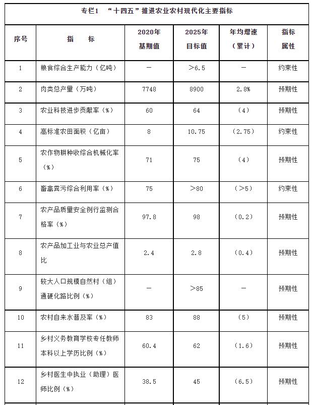 ——粮食等重要农产品供给有效保障。粮食综合生产能力稳步提升,产量保持在1.3万亿斤以上,确保谷物基本自给、口粮绝对安全。生猪产能巩固提升,棉花、油料、糖料和水产品稳定发展,其他重要农产品保持合理自给水平。