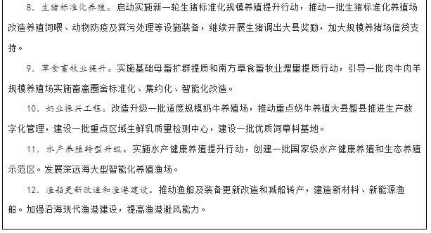 发展现代畜牧业。健全生猪产业平稳有序发展长效机制,推进标准化规模养殖,将猪肉产能稳定在5500万吨左右,防止生产大起大落。实施牛羊发展五年行动计划,大力发展草食畜牧业。加强奶源基地建设,优化乳制品产品结构。稳步发展家禽业。建设现代化饲草产业体系,推进饲草料专业化生产。