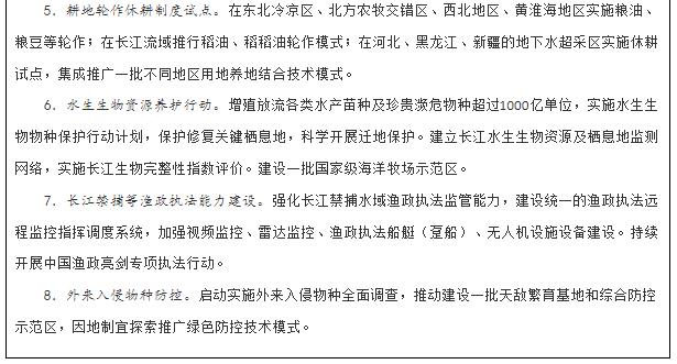 强化农业资源保护。深入推进农业水价综合改革,健全节水激励机制,建立量水而行、以水定产的农业用水制度。发展节水农业和旱作农业,推进南水北调工程沿线农业深度节水。实施地下水超采综合治理。健全耕地轮作休耕制度。落实海洋渔业资源总量管理制度,完善捕捞限额管理和休渔禁渔制度,持续开展海洋捕捞渔民减船转产。严格保护管理珍贵濒危水生野生动物及其栖息地,严厉打击非法捕捞行为,持续开展渔业增殖放流,高标准建设海洋牧场。强化外来入侵物种防控。