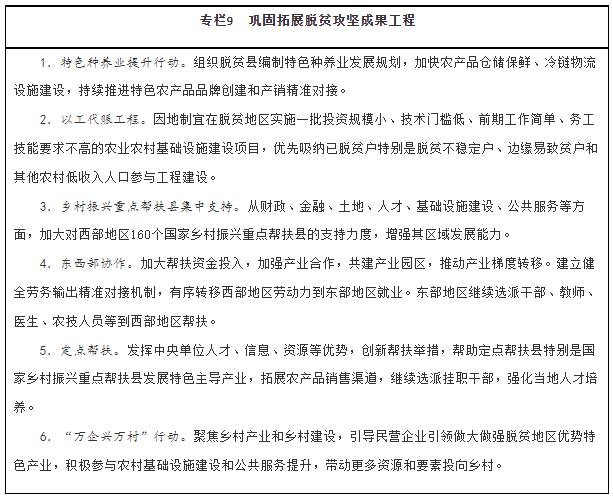 ——脱贫攻坚成果巩固拓展。脱贫攻坚政策体系和工作机制同乡村振兴有效衔接,脱贫人口“两不愁三保障”成果有效巩固,防止返贫动态监测和帮扶机制健全完善并有效运转,确保不发生规模性返贫。