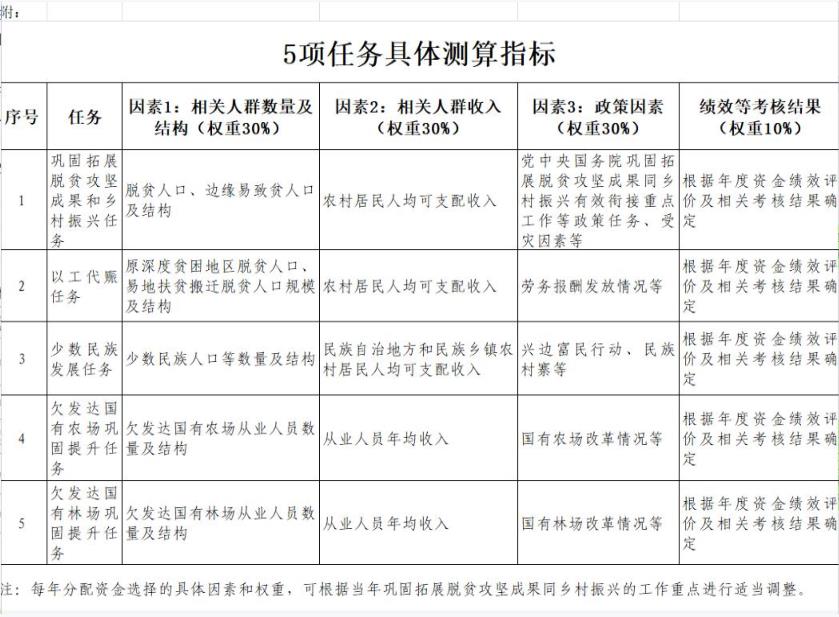 第二条 衔接资金按照巩固拓展脱贫攻坚成果和乡村振兴、以工代赈、少数民族发展、欠发达国有农场巩固提升、欠发达国有林场巩固提升、“三西”农业建设任务进行分配。资金分配按照因素法进行测算,因素和权重为:相关人群数量及结构30%、相关人群收入30%、政策因素30%、绩效等考核结果10%,并进行综合平衡。各项任务按照上述因素分别确定具体测算指标(详见附件)。“三西”农业建设任务按照国务院批准的规模安排。
