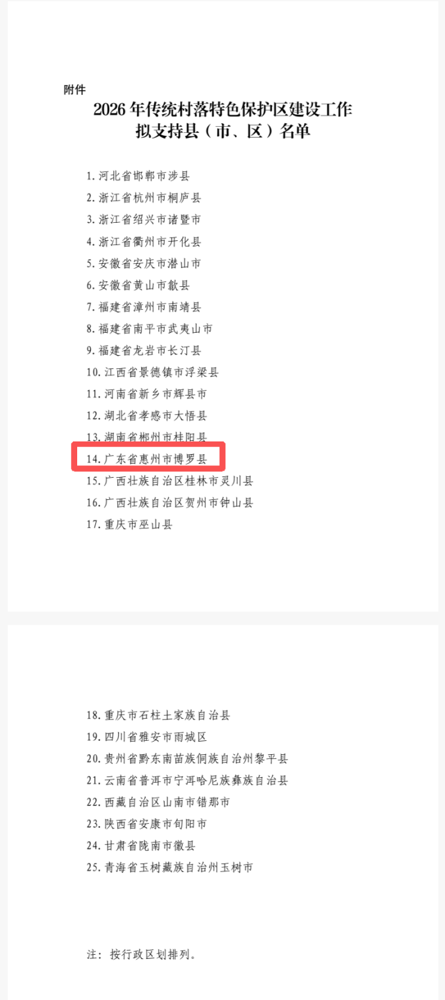 日前,财政部经济建设司、住房城乡建设部村镇建设司发布2026年传统村落特色保护区建设工作竞争性评审结果公示,根据评审结果,惠州市博罗县拟入选2026年传统村落特色保护区,是此次广东省唯一拟入选县,将获得中央补助资金5000万元。作为广东省传统村落保护重点区域,博罗县拥有5个“中国传统村落”,且均已完成挂牌保护及“一村一档”建立工作。
