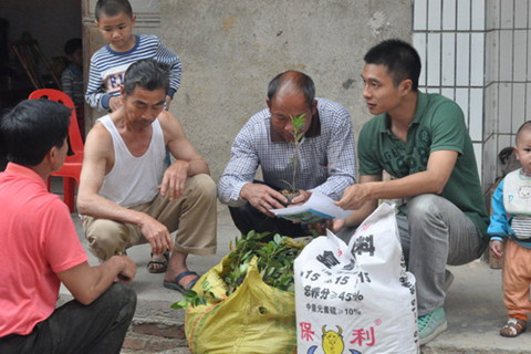 4月15日上午,华南农业大学向扶贫点义都镇中心村的村民送去1.2万株两年生无性系良种嫁接油茶苗、三吨油茶专用复合肥和一批油茶栽培技术资料,为当地油茶产业的发展添砖加瓦,促进村民增收。