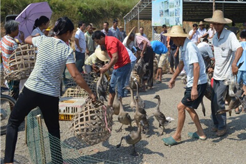 近日,廉江市长山镇文林村委会153户贫困户,高兴地领到了广州开发区萝岗区经济发展局、安监局发放的价值10多万元的鹅,受到当地群众的交口称赞。