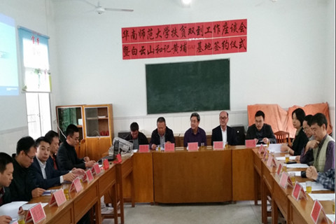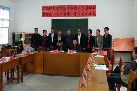 座谈会上,社墩村党总支部书记刘寿全介绍了华南师范大学对口帮扶以来对该村所产生的积极影响和变化,并对学校的大力帮扶表示感谢。学校驻村扶贫工作组组长罗双发汇报了学校自驻村帮扶以来所开展的主要项目和成效。据汇报,截止到2014年11月底,华南师范大学共筹集和争取到各种扶贫开发项目资金295万元,主要用于村基础设施建设、村集体经济增收、发展主导产业、教育帮扶、贫困户增产增收以及民生工程等项目。尤其是在推动主导产业发展方面,我校积极引进了广州白云山和记黄埔中药有限公司,通过“公司+基地+农户”的现代农业产业化模式,在社墩村成立了溪黄草种植基地,发展订单农业。在座谈会上,广州白云山和记黄埔清远分公司常务副总经理邹江林先生表示会继续深化与学校及社墩村的合作,扩大种植规模,力争到2016年溪黄草示范基地达到300亩,推广种植面积达到700亩,带动农户脱贫致富。活动现场,还举行了“社墩村——广州白云山和记黄埔中药有限公司共建溪黄草GAP基地框架协议”的签约仪式。网络教育学院副院长潘战生介绍了拟将开展的连南县教师培训共建项目。