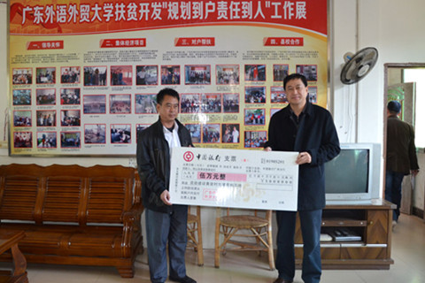 隋广军代表学校向村委捐赠扶贫款,用于发展壮大村集体经济发展,继续建设黄坌村生猪养殖场和生态建设基地。
