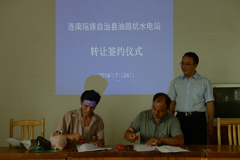 省委政法委帮扶连南瑶族自治县塘冲村购买改建油路坑水电站,图为产权转让签约仪式