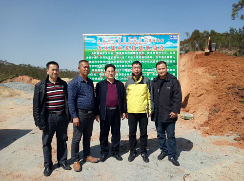 广东出入境检验检疫局驻中洞村第一书记詹俊东(右二)带队参观肉牛集中养殖基地,向省政府特聘参事、省扶贫开发协会常务副理事长兼秘书长钟韶彬(中)汇报项目建设情况。