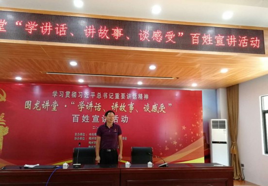 他讲述了精准扶贫的“十子连心专注用心用情,打开水美致富路”的精准脱贫感人故事,讲了许多故事,用“述贫法”来精准识别贫困户,用“多干多得,奖勤罚懒”的奖励办法等制度扶贫来激励贫困户内生脱贫动力,将24字社会主义核心价值观与传统文化结合,用“仁义礼智信善孝”作为自然村的核心要义,还给村民发放家风牌,组织孩子们诵读《弟子规》等,结合村的实际开展党员带富活动及关爱空巢老人活动等,制定村规民约,纯洁文明村风,提升脱贫质量等故事。“今天的活动很接地气,讲的都是很实在的东西,比如关爱空巢老人、资助贫困孩子、邻里和睦相处等很多事例和道理,都很在理。百姓的故事通过百姓讲出来,百姓都听得董、乐意听、也容易接受。”村民曾燕说。