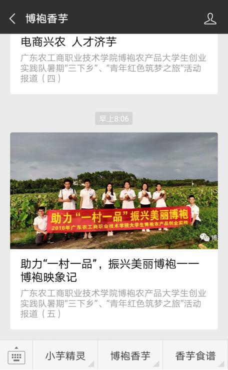 博袍农产品大学生创业团队拜访了博袍村老党员和乡贤,调查收集博袍村的文化品牌资源;用镜头记录美丽博袍新气象——乡村古树下怡然自得的村民、鲜绿的香芋基地、宽阔的村道、高耸的水塔、便民的卫生站、在建村党支部公共服务中心……团队制作的《博袍映象记》在腾讯视频上线不到一天,点击量近千。团队微店动态播报博袍香芋收割进展,吸引越来越多人关心支持“一村一品”博袍香芋。