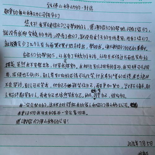 近日,中国移动佛山分公司对口帮扶湛江市坡头区乾塘镇沙城村的孤儿贫困户林某向正在入户走访的扶贫干部杨旭康送来了一封感谢信,信中写道:“我是被你们公司帮助的人,感谢你们的帮助,没有了你们,就没有我那安稳的生活,没有了你们,就没有我今天的生活费用,没有了你们,就会少了几个人在后面默默的支持我,帮助我。谢谢你们的无私奉献。我一定会努力的,这样才对得起我的家人和佛山移动公司。”