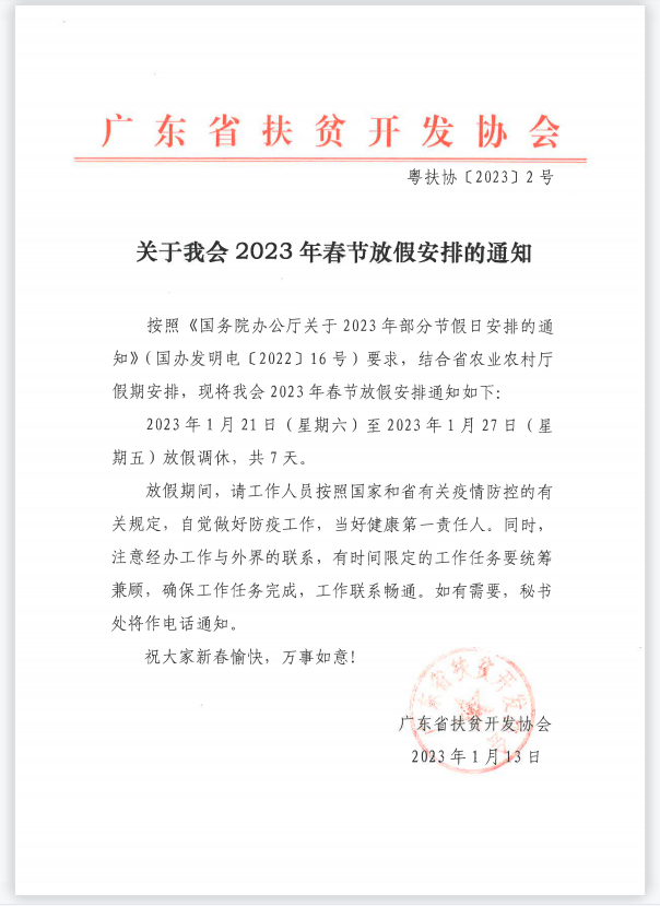 关于我会2023年春节放假安排的通知 按照《国务院办公厅关于2023年部分节假日安排的通知》(国办发明电〔2022〕16号)要求,结合省农业农村厅假期安排,现将我会2023年春节放假安排通知如下: 2023年1月21日(星期六)至2023年1月27日(星期五)放假调休,共7天。 放假期间,请工作人员按照国家和省有关疫情防控的有关规定,自觉做好防疫工作,当好健康第一责任人。同时,注意经办工作与外界的联系,有时间限定的工作任务要统筹兼顾,确保工作任务完成,工作联系畅通。如有需要,秘书处将作电话通知。 祝大家新春愉快,万事如意!广东省扶贫开发协会 2023年1月13日