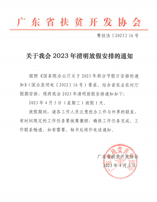 按照《国务院办公厅关于2023年部分节假日安排的通知》(国办发明电〔2022〕16号)要求,结合省农业农村厅假期安排,现将我会2023年清明放假安排通知如下: