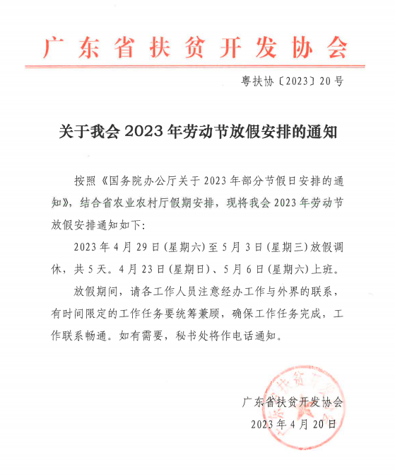 2023年4月29日(星期六)至5月3日(星期三)放假调休,共5天。4月23日(星期日)、5月6日(星期六)上班。