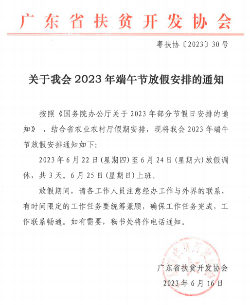 按照《国务院办公厅关于2023年部分节假日安排的通知》 ,结合省农业农村厅假期安排,现将我会2023年端午节放假安排通知如下: