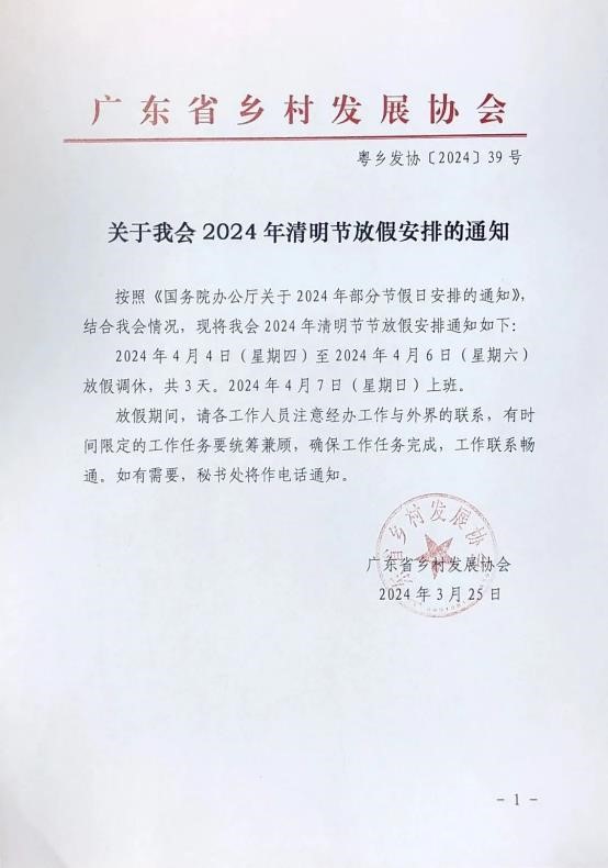按照《国务院办公厅关于2024年部分节假日安排的通知》,结合我会情况,现将我会2024年清明节放假安排通知如下: