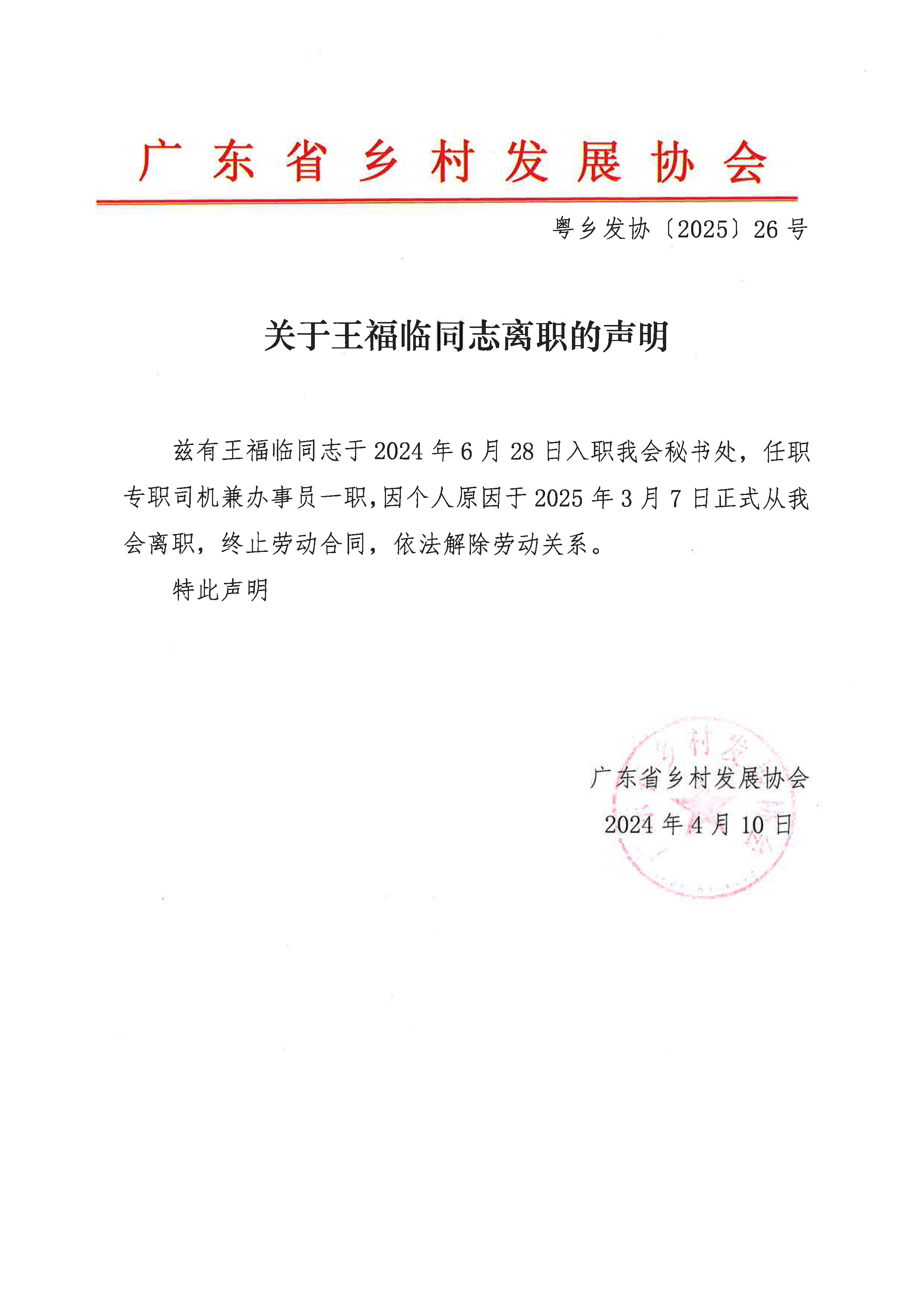 兹有王福临同志于2024年6月28日入职我会秘书处,任职专职司机兼办事员一职,因个人原因于2025年3月7日正式从我会离职。