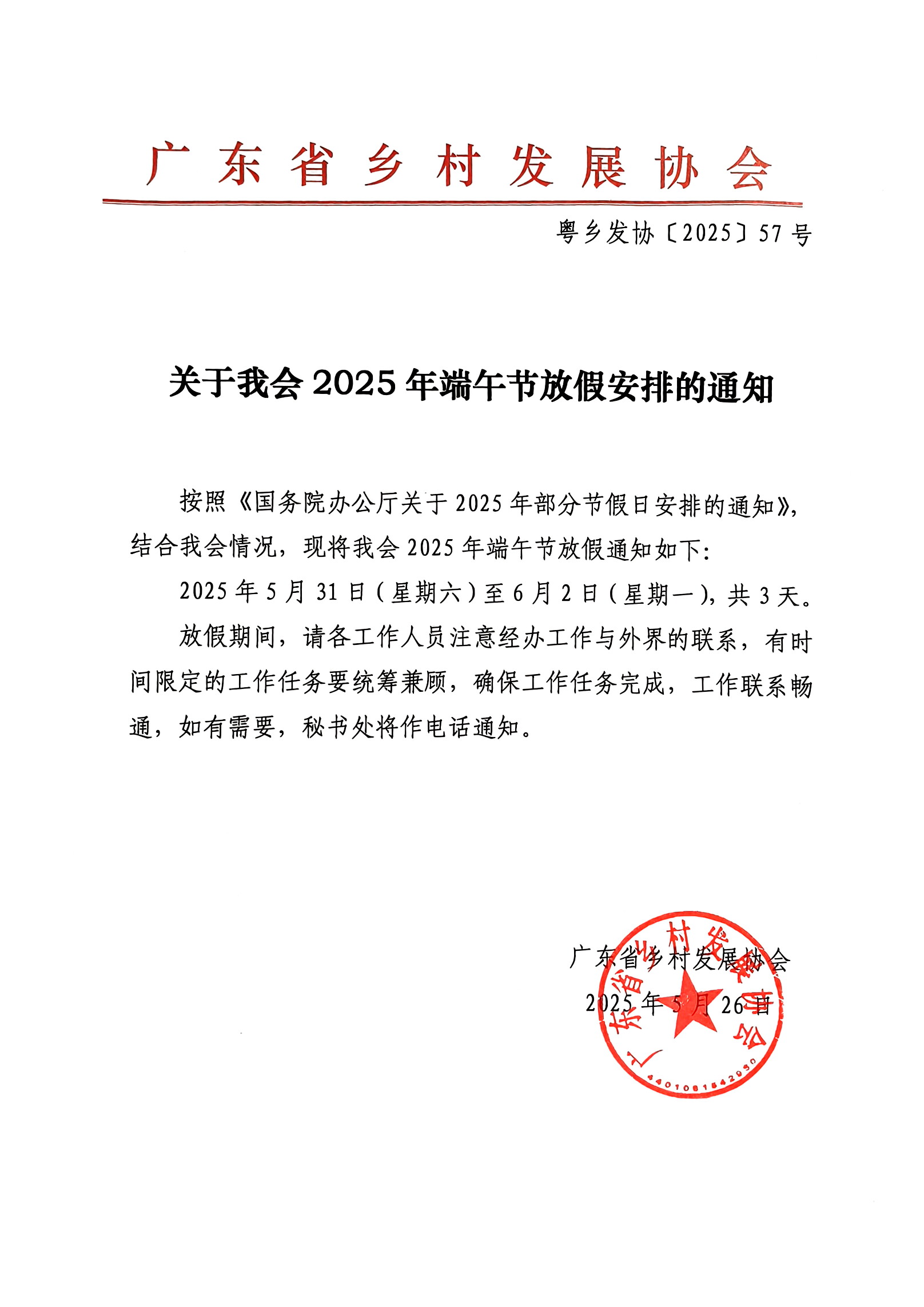 按照《国务院办公厅关于2025年部分节假日安排的通知》,结合我会情况,现将我会2025年端午节放假通知如下: