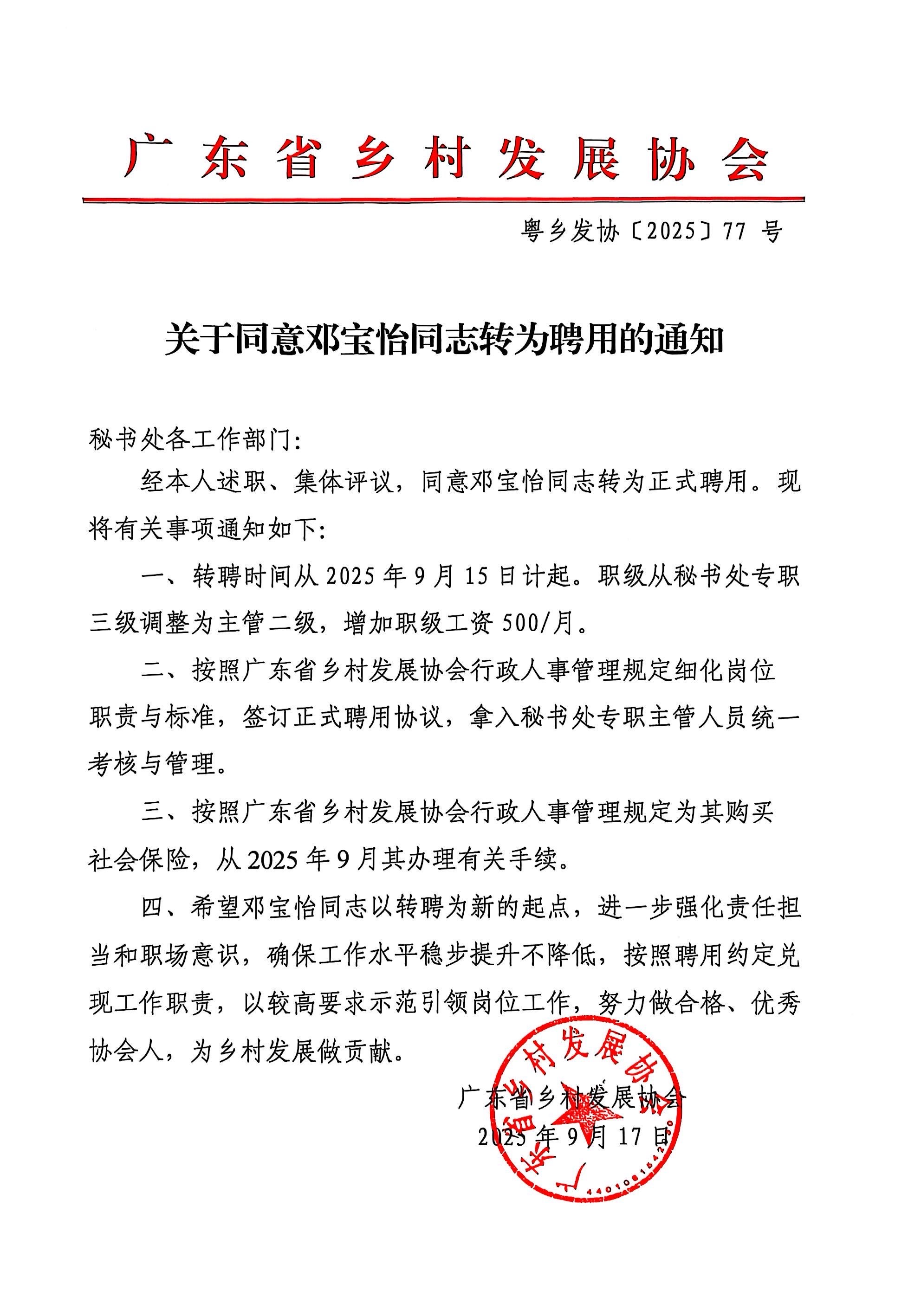 经本人述职、集体评议,同意邓宝怡同志转为正式聘用。现将有关事项通知如下: