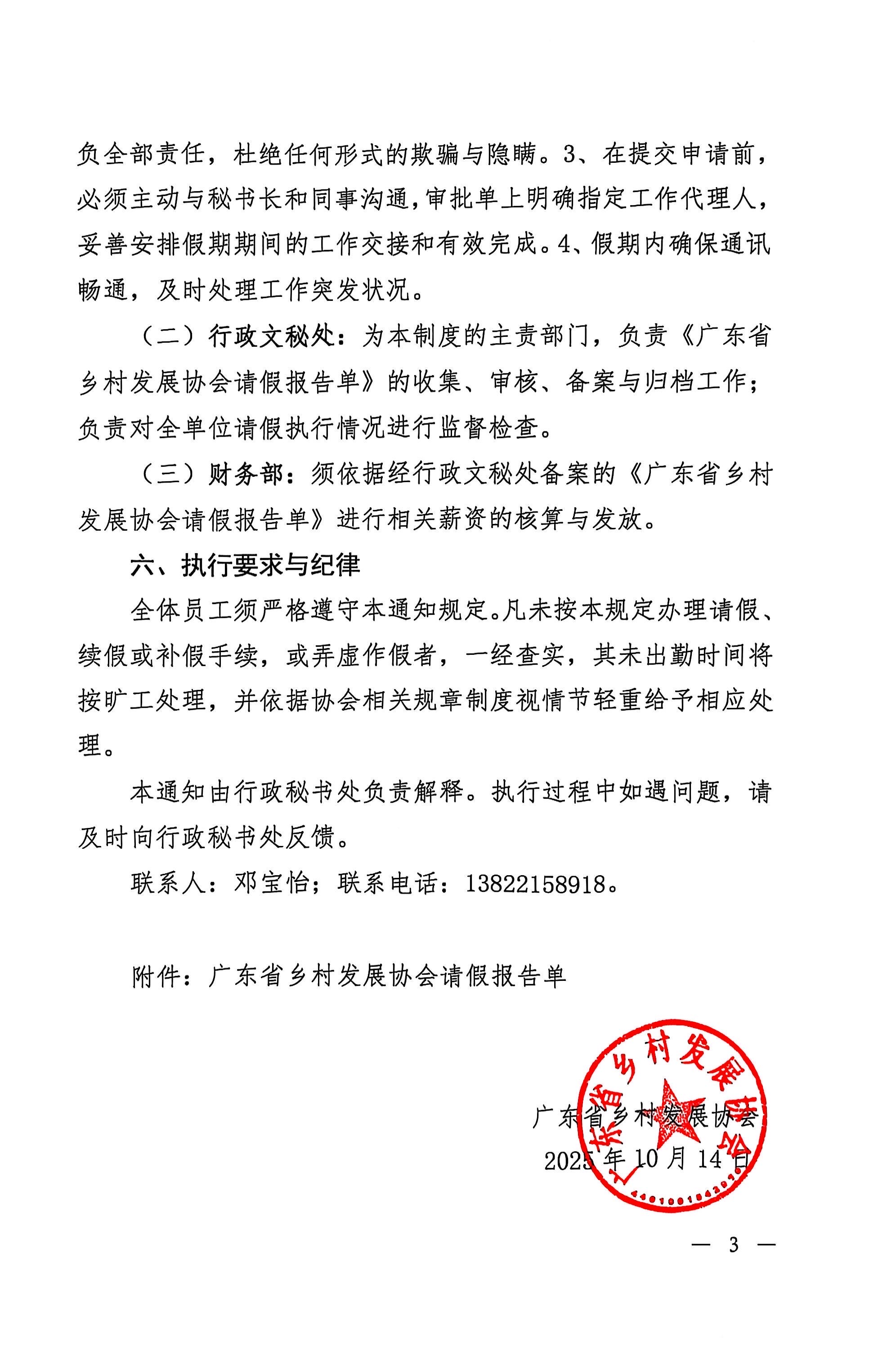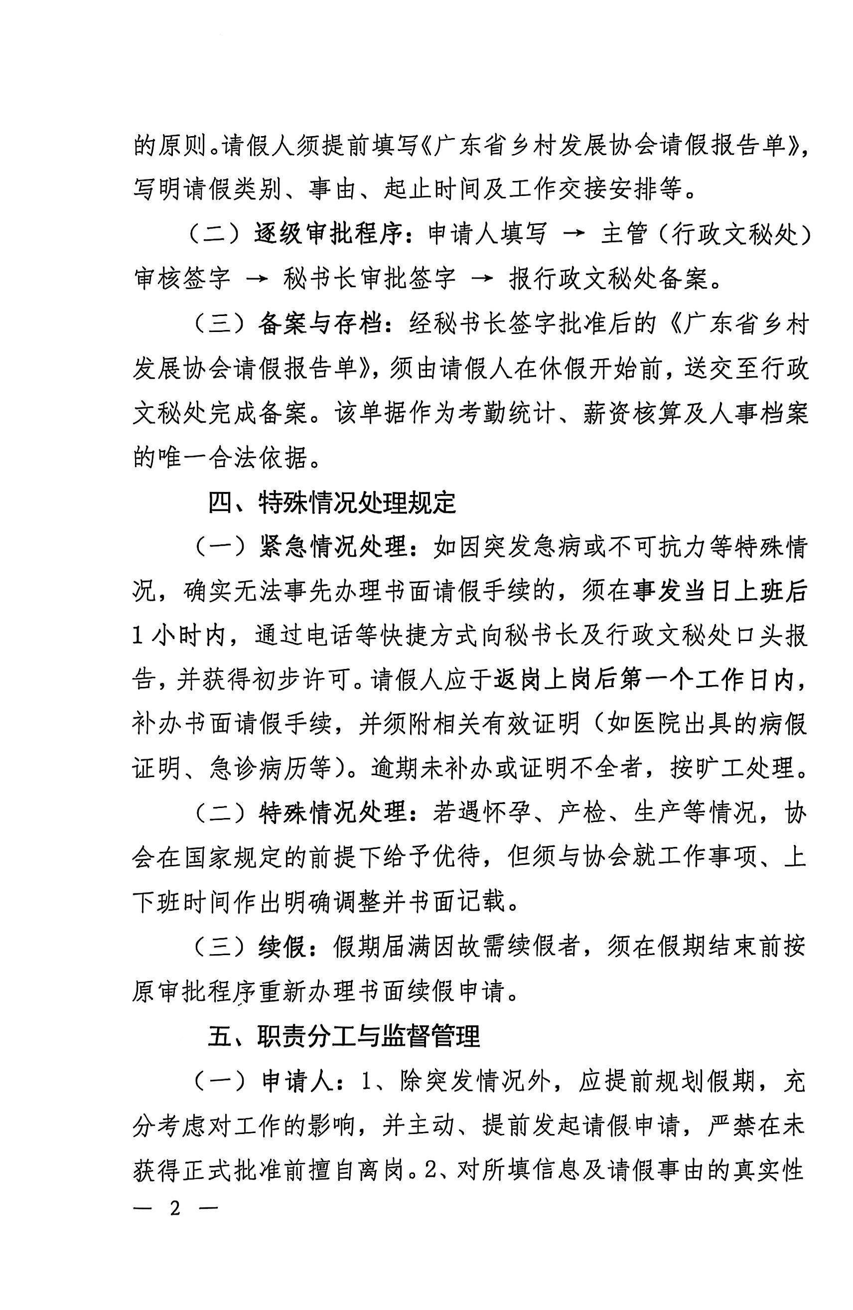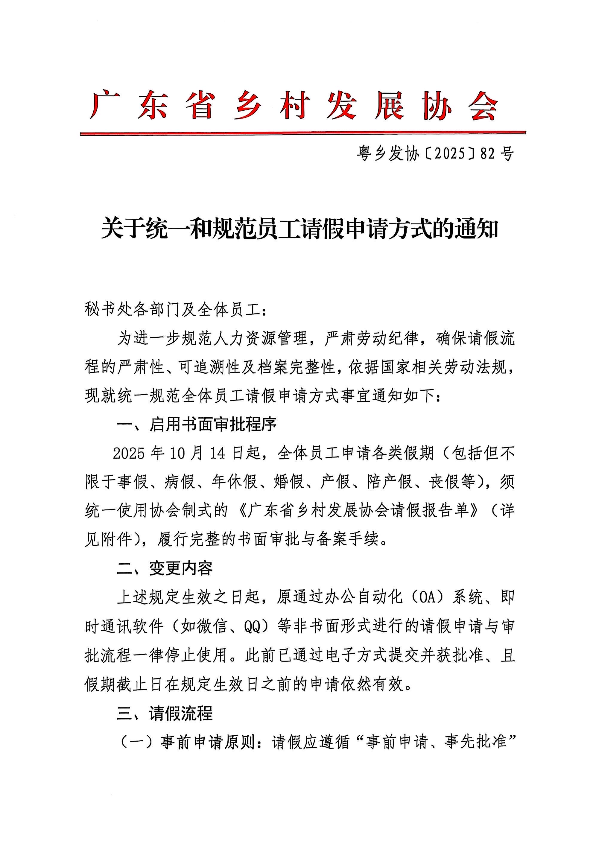 2025年10月14日起,全体员工申请各类假期(包括但不限于事假、病假、年休假、婚假、产假、陪产假、丧假等),须统一使用协会制式的《广东省乡村发展协会请假报告单》(详见附件),履行完整的书面审批与备案手续。