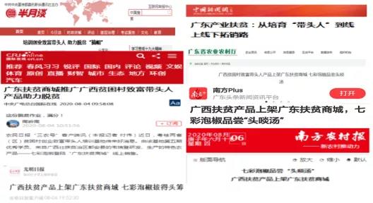 光明日报客户端、南方农村报分别刊登了《广西扶贫产品上架广东扶贫商城,七彩泡椒拔得头筹》、《广西扶贫产品上架广东扶贫商城,七彩泡椒品尝“头啖汤”》,对于“广东扶贫商城以创新形式上线农产品,加力扶贫产品变现”的行动大加褒扬。指出广东扶贫商城与线下展销中心的结合是保障扶贫产业立得住、不烂尾,扶贫产品销得出、卖得好,实现变现增值的关键一招,以创新扶贫载体形式带动扶贫产品向更广阔的市场进军,将一家家农产品推向全国,让一个个贫困农户自力致富。