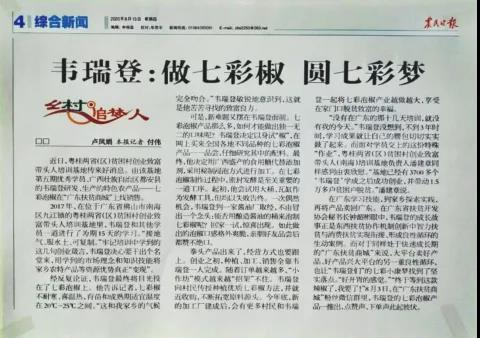 广东扶贫全媒体中心讯(通讯员/卢凤娟) 广东扶贫商城自8月初上线广西贫困村创业致富带头人韦瑞登开发的特色农产品七彩泡椒以来,不断引发媒体广泛关注。8月13日,农民日报刊出《韦瑞登:做七彩椒,圆七彩梦》平面报道,将此新闻效果再次放大,商务部在其全国农产品商务信息公共服务平台全文播报此新闻,不仅为广东扶贫商城上线贫困村创业致富带头人产品宣传画上浓墨重彩的一笔,更为产品推广开辟了无限广阔的市场。