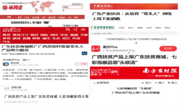 ▲各大媒体报道广东扶贫商城上架广西贫困村创业致富带头人农产品的新闻截图