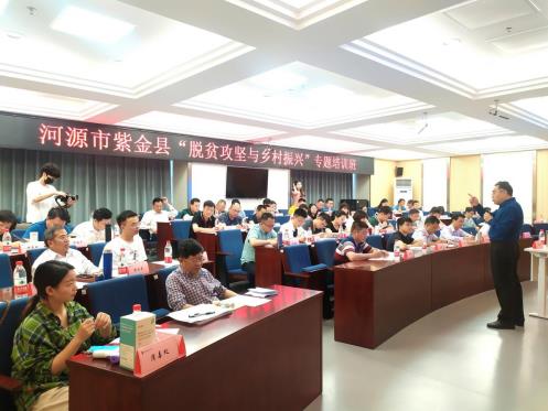 广东扶贫全媒体中心讯(通讯员/黄春霞) 4月16日上午,省人民政府参事室特约研究员、省扶贫开发协会常务副理事长兼秘书长、省南方扶贫开发研究院院长钟韶彬应邀为河源市紫金县“脱贫攻坚与乡村振兴”培训班授课,专题辅导脱贫攻坚全面胜利后的“三农”工作。这是继党中央宣布脱贫攻坚取得全面胜利后,如何做好巩固拓展脱贫攻坚成果与全面推进乡村振兴有效衔接的首场讲座,引导山区农业县把握好新发展阶段加快农业农村现代化步伐。