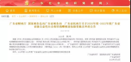 ▲广东省社会组织信息网关于广东省省级公益性社会组织捐赠税前扣除资格名单的公告