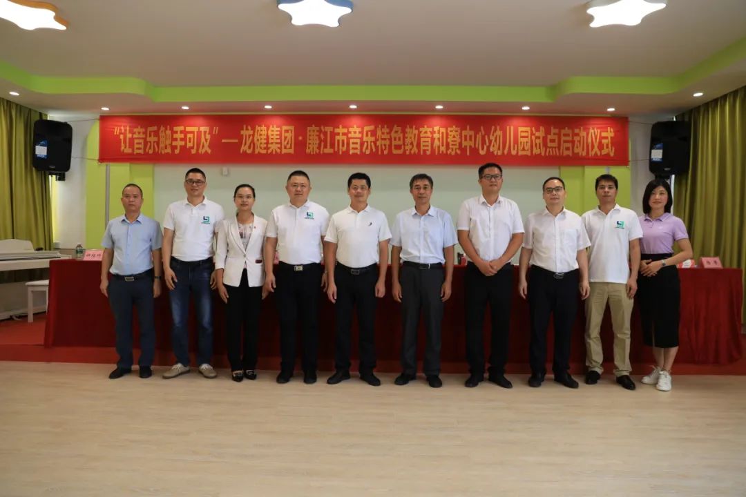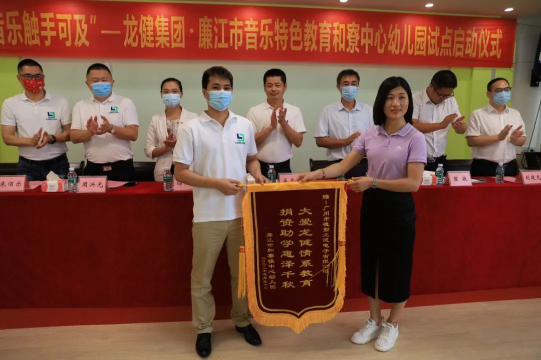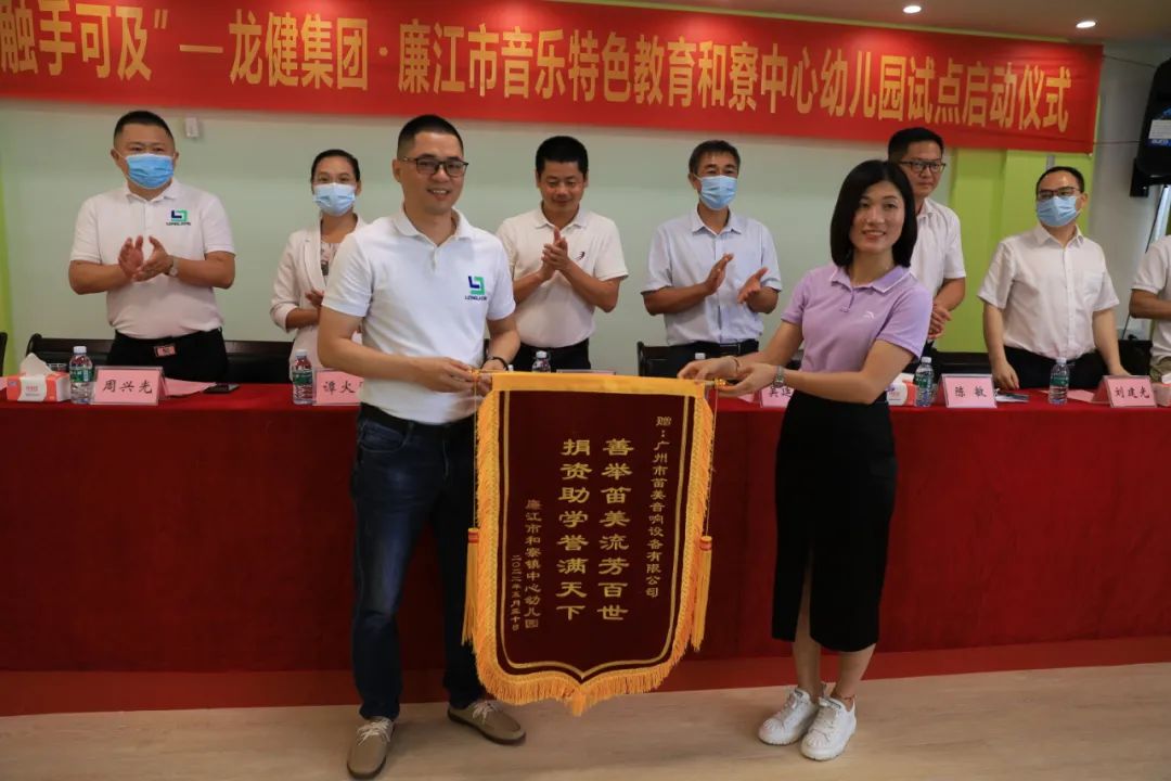 作为2021年1月,由广东省扶贫开发协会主办,龙健集团、中共廉江市委宣传部支持举办,东莞市美派电子科技有限公司、广州市笛美音响设备有限公司、厅厅教育科技(广东)有限公司、广东龙健电子科技有限公司等龙健集团旗下子公司协办的“广东省扶贫开发协会音乐下乡工作委员会成立暨音乐下乡公益活动”的延续,“让音乐触手可及”——龙健集团·廉江市音乐特色教育和寮中心幼儿园试点启动仪式5月30日在和寮中心幼儿园隆重举行。廉江市副市长卓志强,市教育局党组书记、局长吴廷武,和寮镇委书记谭火兰,镇长陈敏,龙健集团副总裁周兴光,龙健集团音乐下乡公益工作组秘书、广州市笛美音响设备有限公司总经理朱佰乐,广州德勤龙健电子有限公司大项目总监张锡明,以及市教育局、和寮镇中心小学、中心幼儿园相关领导,中心幼老师代表等出席了启动仪式。