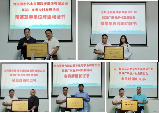省乡村发展协会为亿金金属、东源板栗、茗露茶叶、源丰农业、美林农业颁发成员单位牌匾和证书