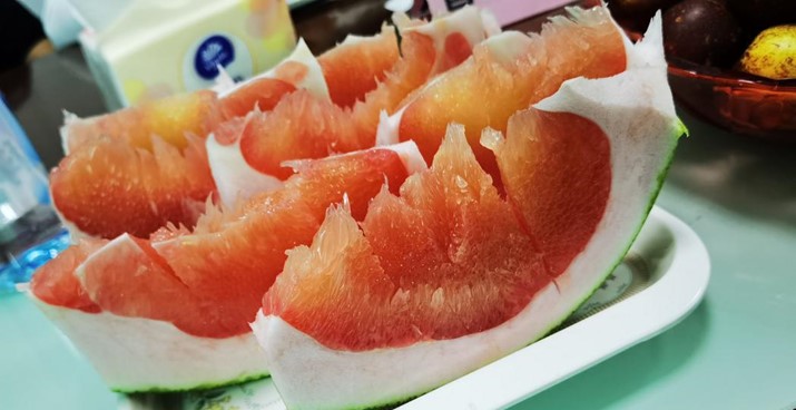 红宝石青柚外青内红,果肉的外层为红色,靠近果心的部分呈黄色,因似红宝石而得名。它源于泰国南部洛坤府,为泰国皇室专供,是名副其实的“贵族水果”。虽已有几十年的历史,但由于泰国的种植管理方式落后,总产量低,价格不菲。据介绍,2017年我国才引进该品种,目前只在部分地方少量种植,还未形成成熟的栽培和管理种植系统。高昂的价格也使它目前基本只在中高端市场出现,供不应求。